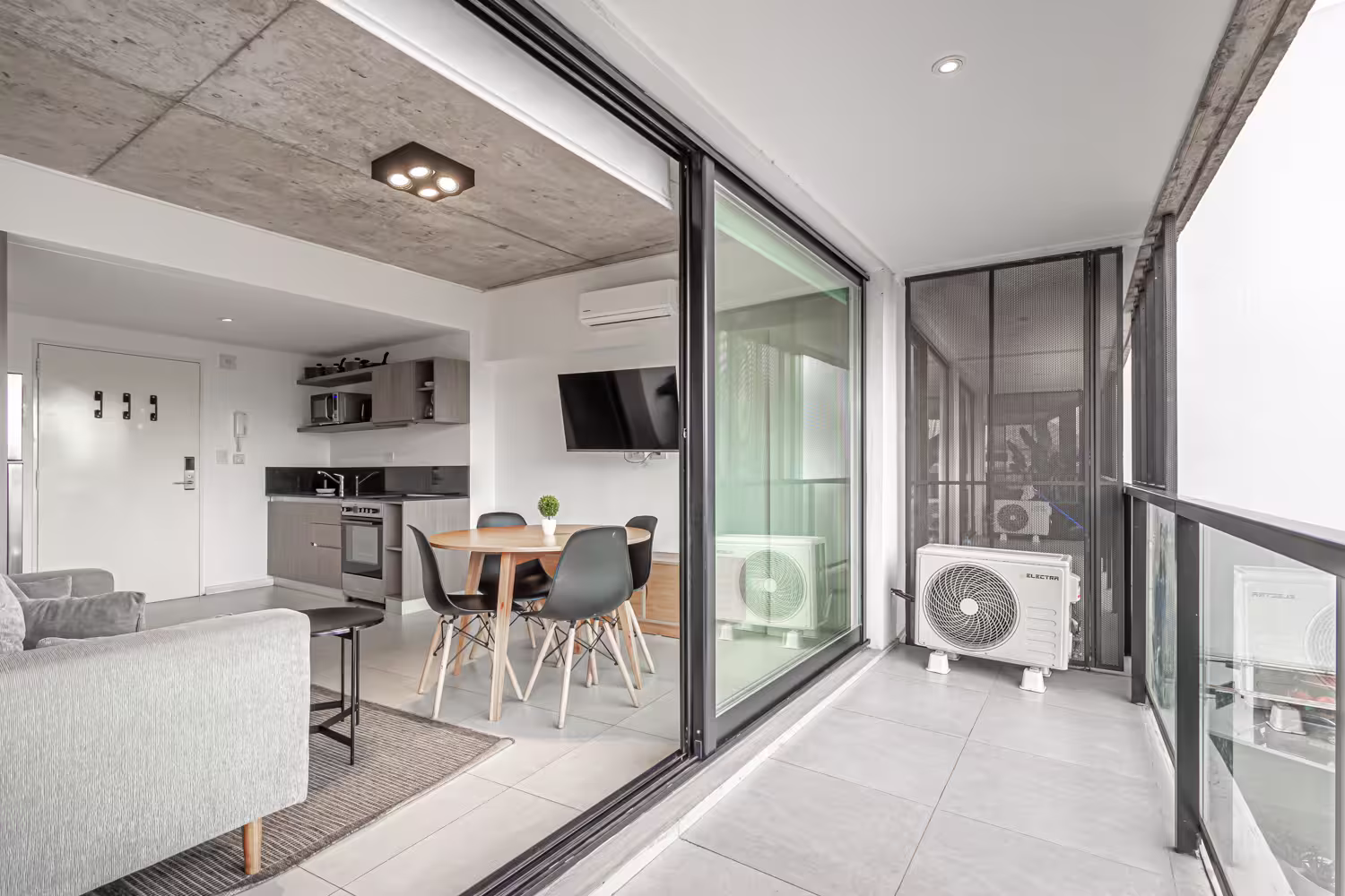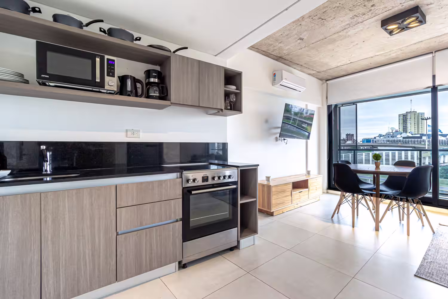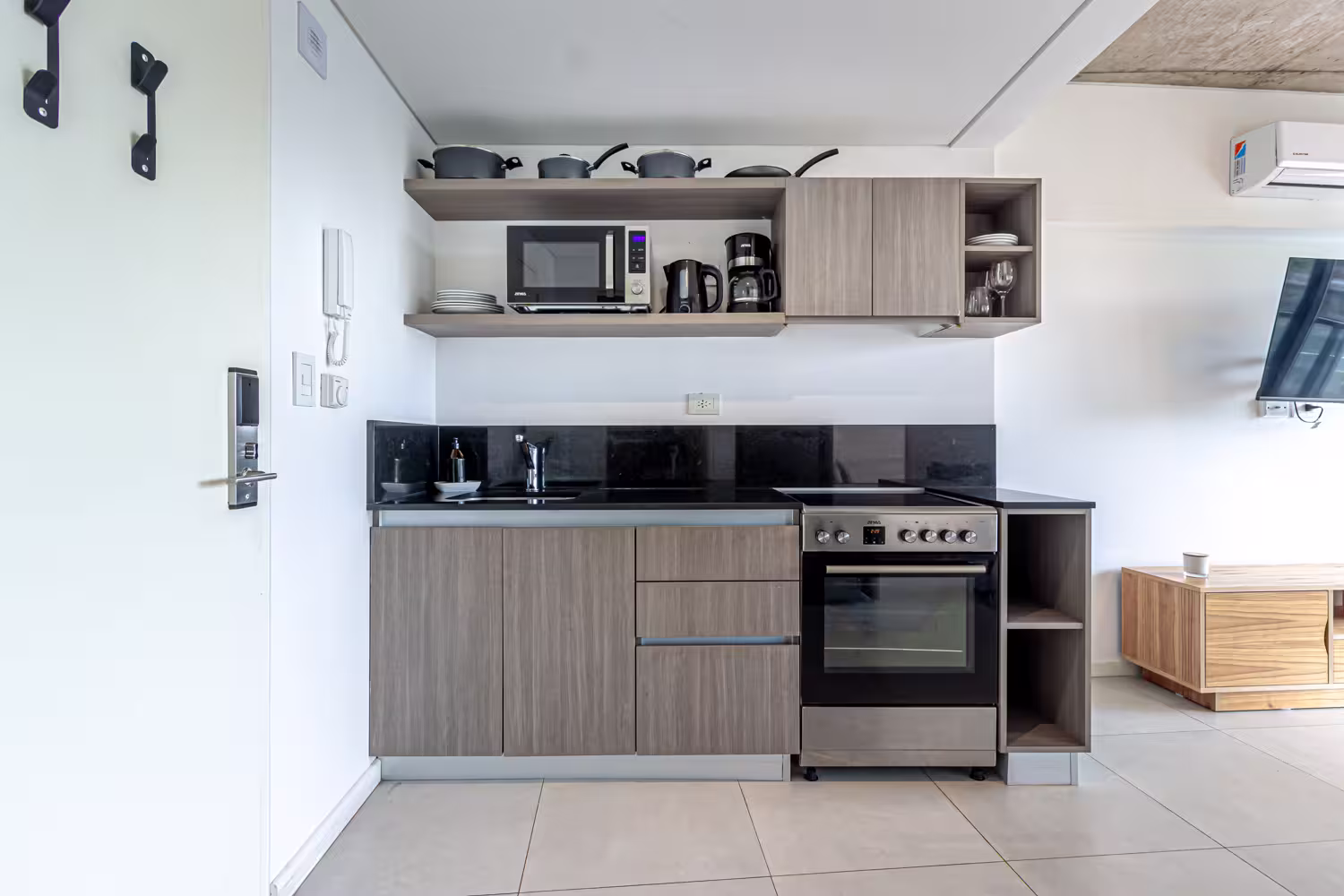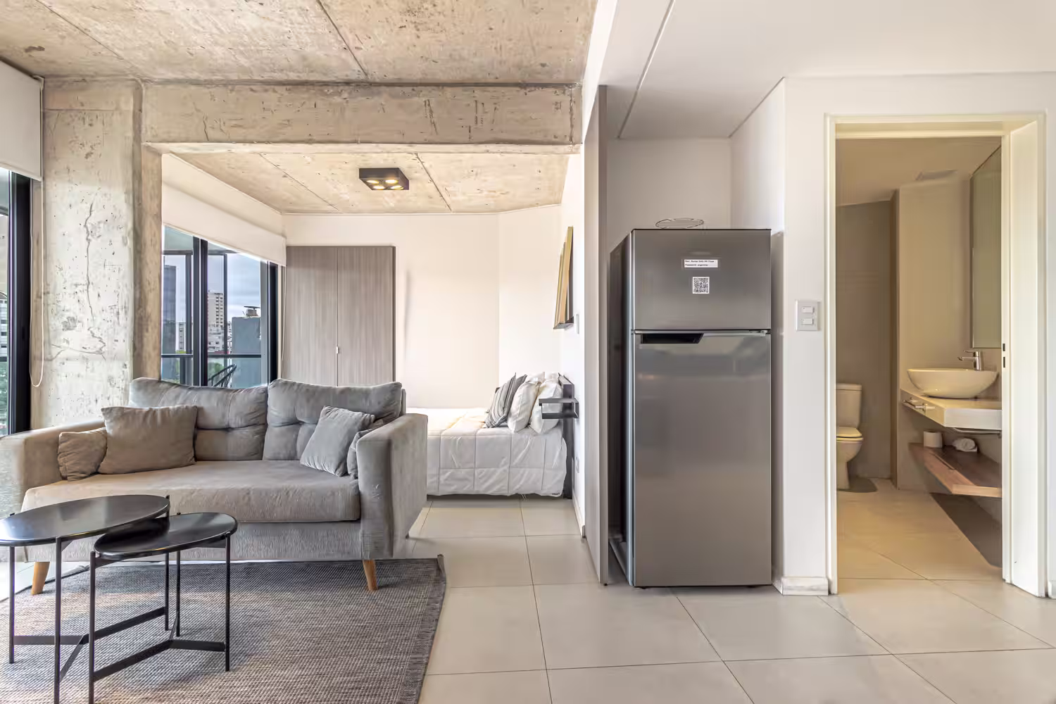 Descubre la elegancia y el confort en este estudio luminoso, donde una cocina totalmente equipada y una zona de trabajo bien iluminada te brindan todo lo que necesitas para sentirte como en casa. Con su diseño moderno y sus acabados de alta calidad, este monoambiente es el lugar perfecto para relajarte después de un día explorando la ciudad. demás, el edificio cuenta con un espacio de coworking donde puedes trabajar de manera cómoda